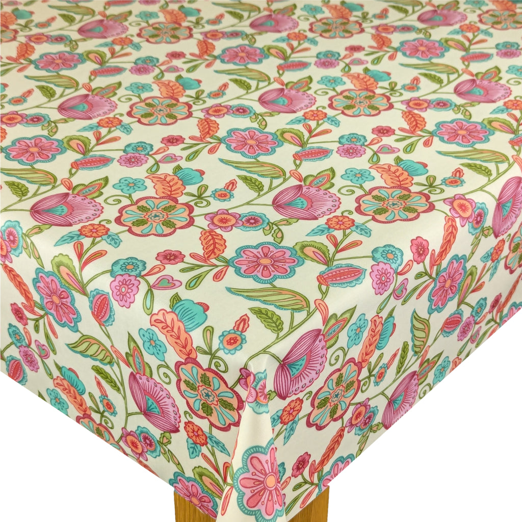 This cheerful floral design has a fresh, playful contemporary feel to it, with its bold, vibrant colourways. Camellia is a printed half-panama fabric that has a clear wipeable coating and a matt finish It is designed to be multi-directional in pattern, making your table look perfect from any angle.