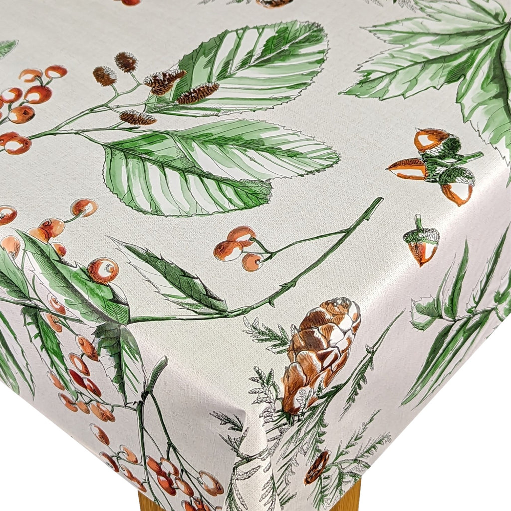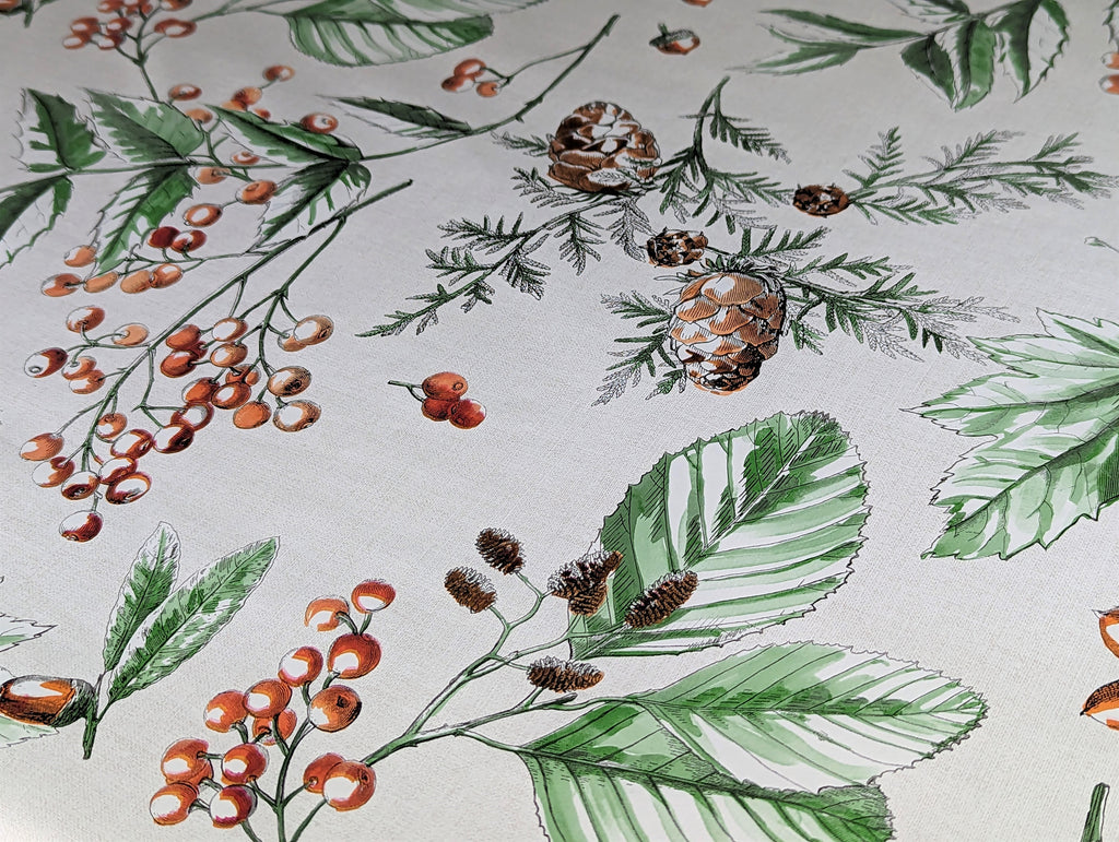 Christmas Berries and Leaves Red Grey vinyl tablecloth with a non woven textile backing and wipe clean plastic surface. This is also known as PVC tablecloth can be used as a wipe clean tablecloth. It does not fray and can easily be cut to shape. Available in a standard width of 140cm and available in any continuous length up to 20 metres.