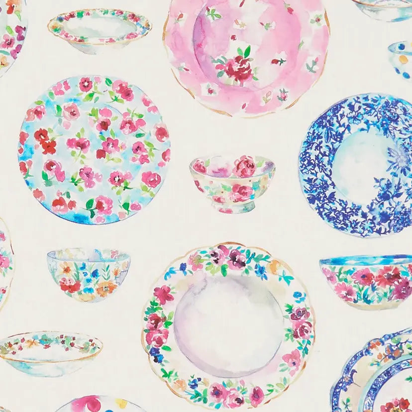 This Clarke and Clarke oilcloth tablecloth showcases a refined design featuring decorated cups, plates, and bowls embellished with graceful floral motifs, set against an elegant pale cream ground. Ideal for an afternoon tea party. Manufactured from quality cotton fabric and digitally printed , then coated with a clear wipeable finish, the oilcloth provides superior protection for your table against spills yet still uses an eyecatching design that performs reliably in both formal and casual dining settings.