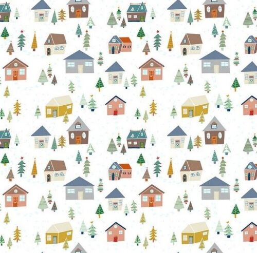 Christmas Ski Chalet Oilcloth fabric by Prestigious Textiles with ski chalets, pine trees on a snowy white background. 100% cotton coated with a hardwearing wipe clean plastic, this oilcloth fabric also known as PVC tablecloth can be used as a wipe clean tablecloth and because it does not fray can easily be cut to shape.