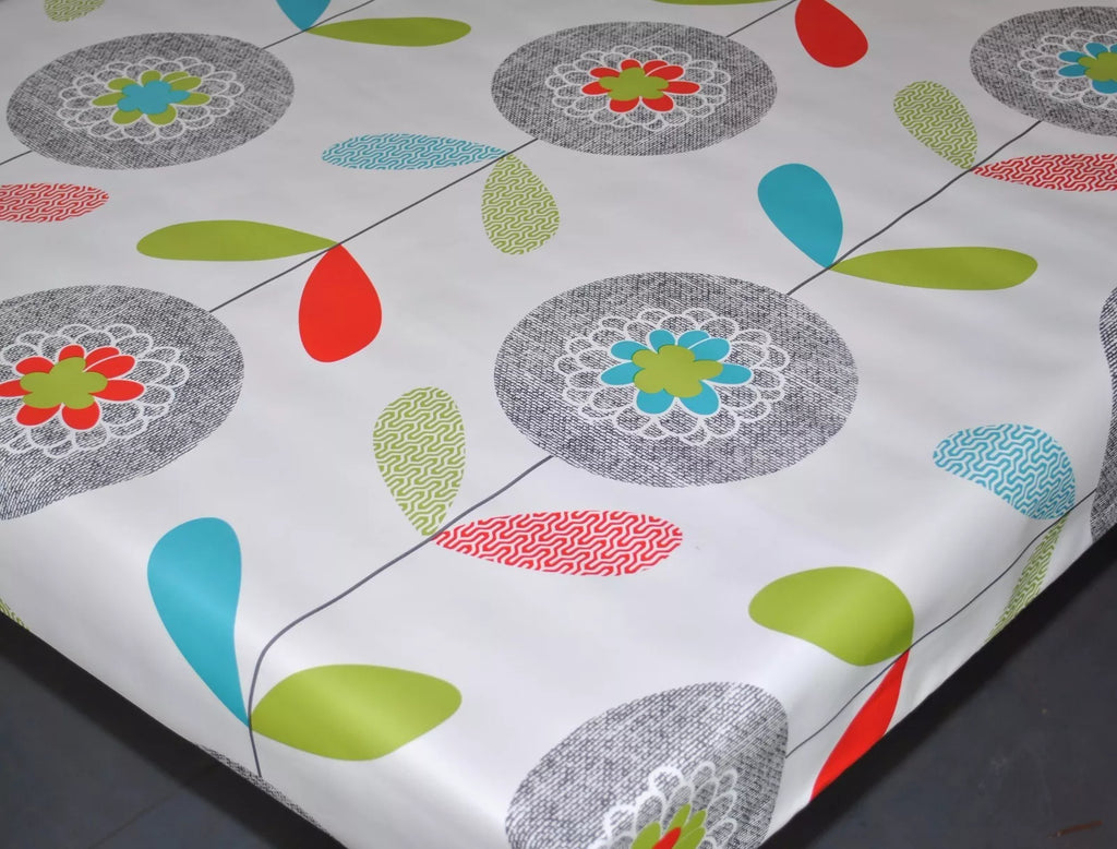 Retro Flowers and Stems on White PVC Vinyl Wipe Clean Tablecloth 120cm x 140cm Warehouse Clearance