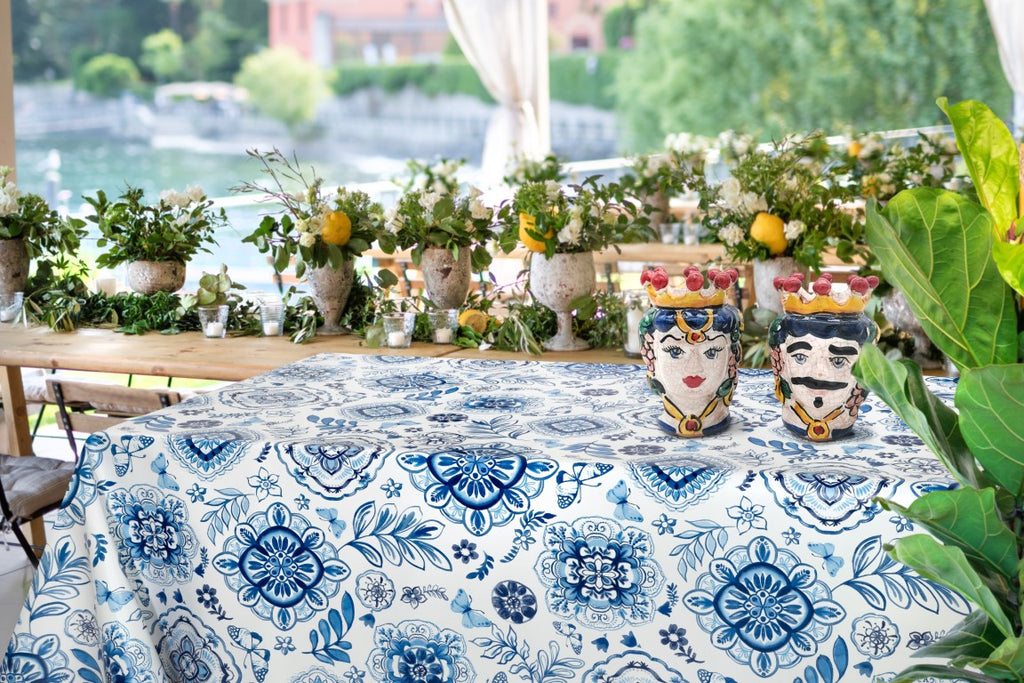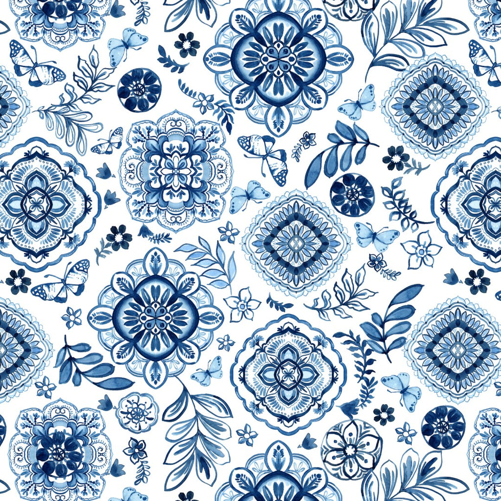 Sophia Tiles Blue coloured design vinyl tablecloth with a non woven textile backing and wipe clean plastic surface. This is also known as PVC tablecloth can be used as a wipe clean tablecloth. It does not fray and can easily be cut to shape. Available in a standard width of approx 137cm and available in any continuous length from 50cm all the way up to 20 metres.